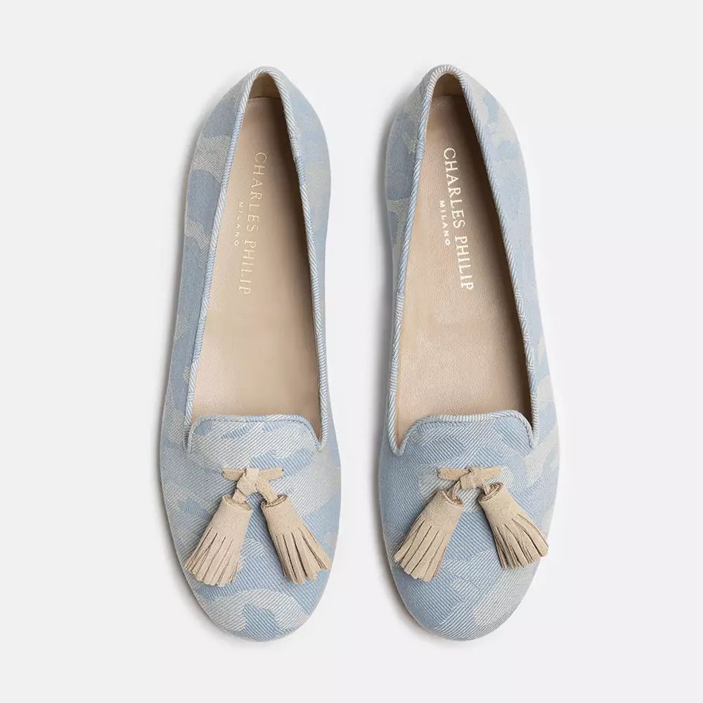 Step into unmatched comfort and effortless style with these exquisite light blue camouflage-print cotton denim loafers, adorned with a chic beige suede tassel. Designed and meticulously handmade in Italy, these shoes boast a minimal heel height for day-long ease without compromising on style. The supple leather lining, insole, and cotton heel pad all combine to ensure maximum comfort, making every step a statement in luxury. Experience the artisanal craftsmanship of Charles Philip with every wear.