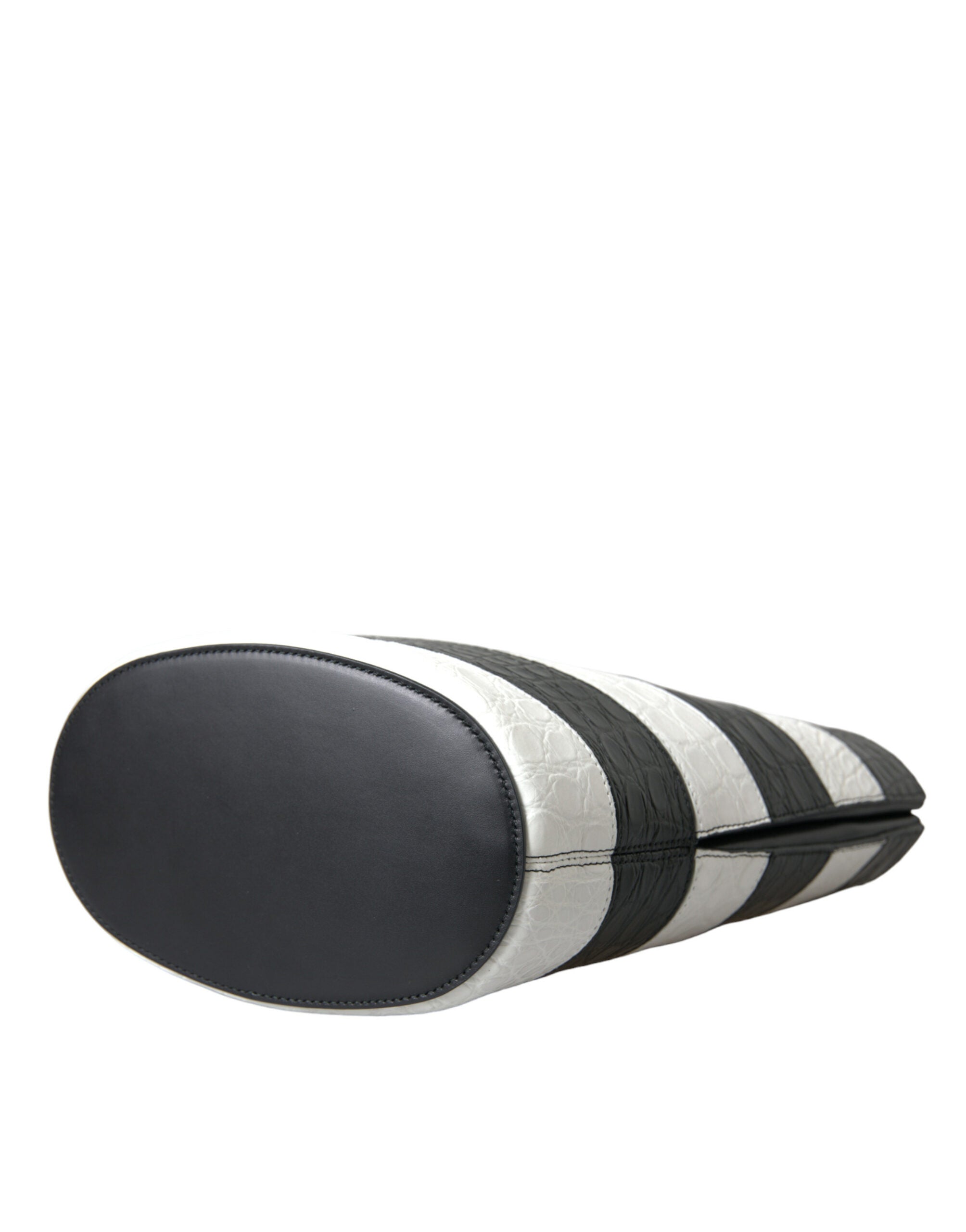 Indulge in the epitome of luxury with the Balenciaga crocodile leather maxi bucket bag. This 100% Authentic, stunning accessory is fresh from the fashion house with original tags, ready to elevate your style. Perfect for those who appreciate the fine craftsmanship, it features a sleek black and white palette matched with the prestige of crocodile leather, further enhanced by lamb and calf leather details.
