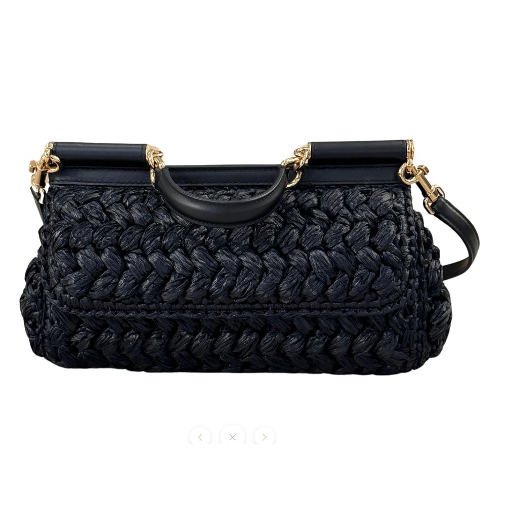 Dolce & Gabbana bag in black raffia and calfskin. Front opening with flap, spotted fabric interior and zip pocket. Rigid leather top handle and removable and adjustable shoulder strap. Golden hardware and five support feet.