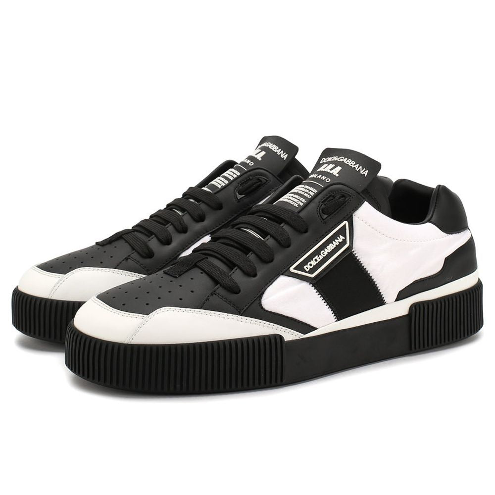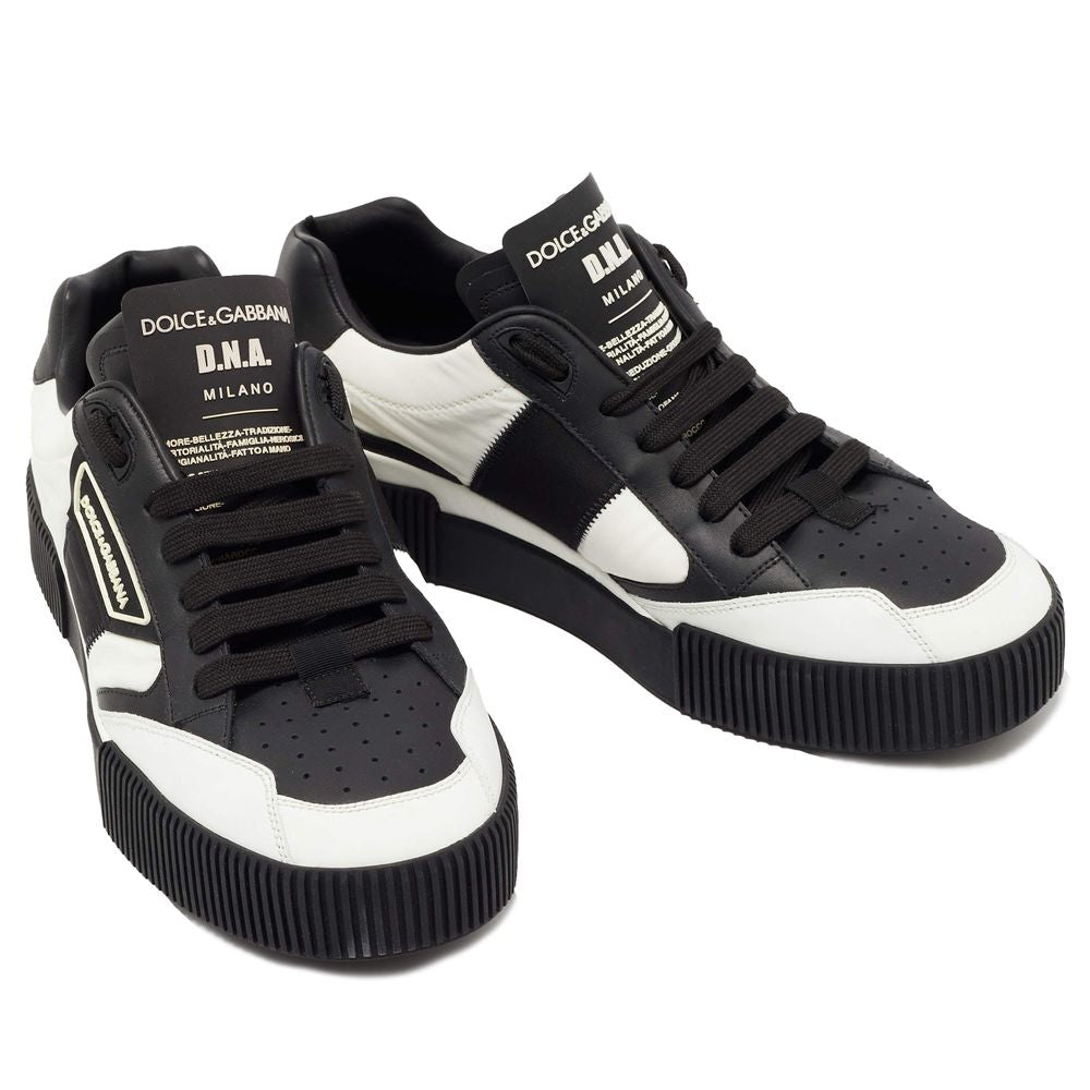 Dolce & Gabbana black and white calfskin low top sneaker with technical fabric parts and side rubber logo, black rubber sole with striped groove