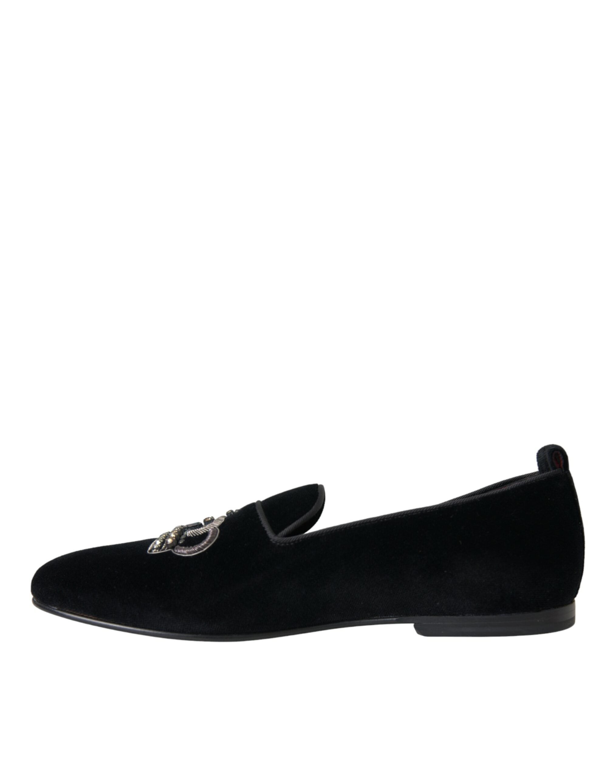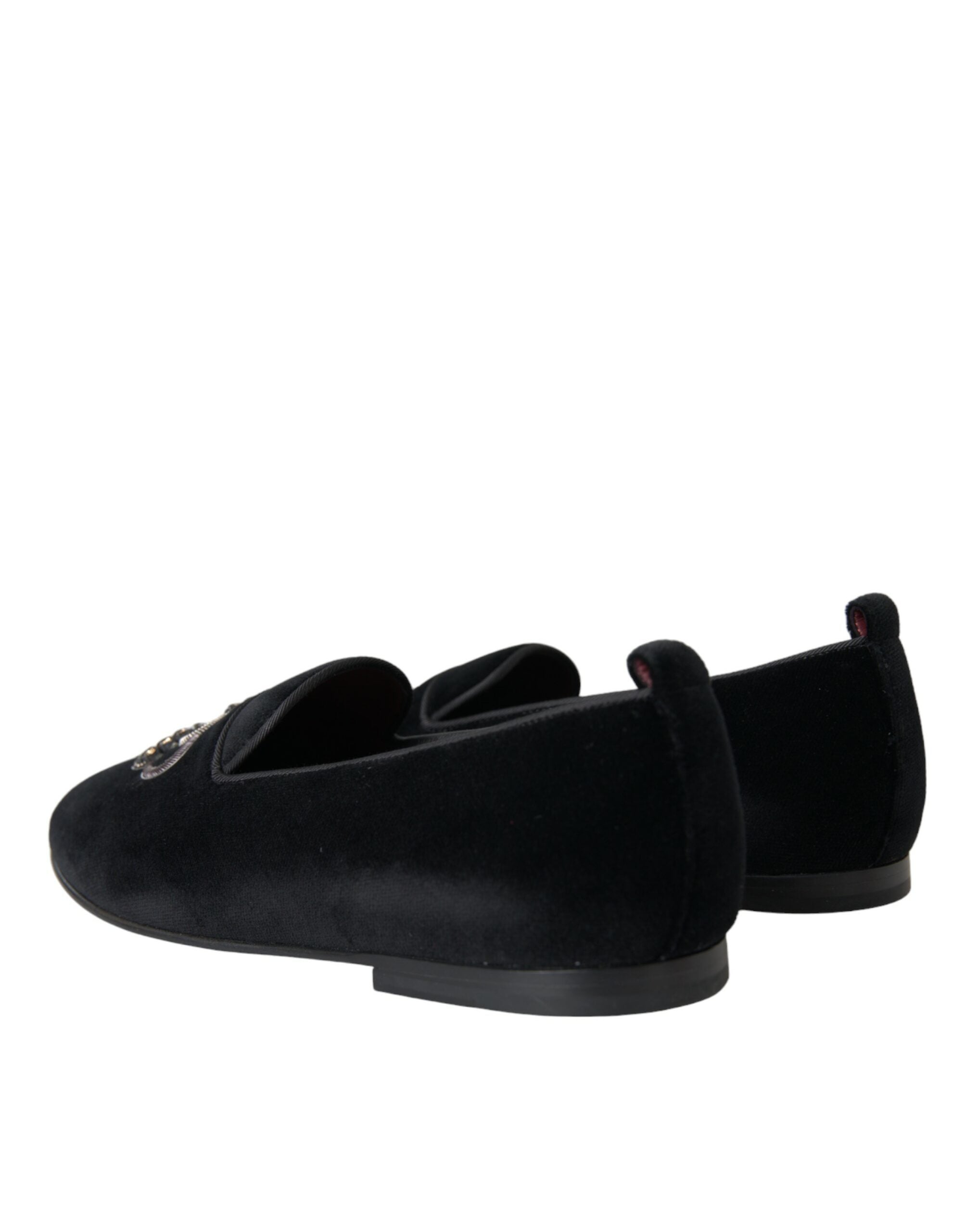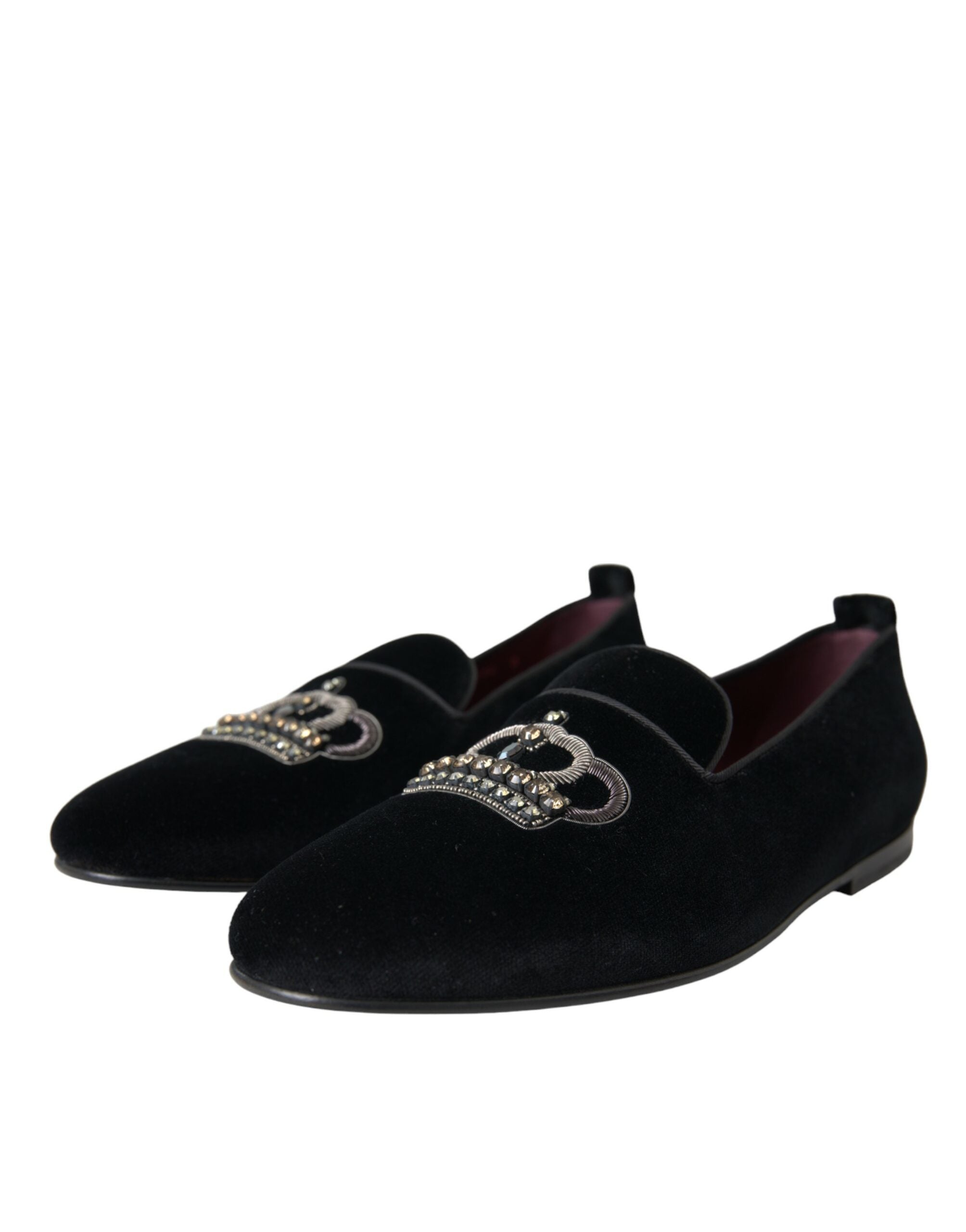Dolce & Gabbana Black Velvet Crystal Crown Men Loafers Shoes