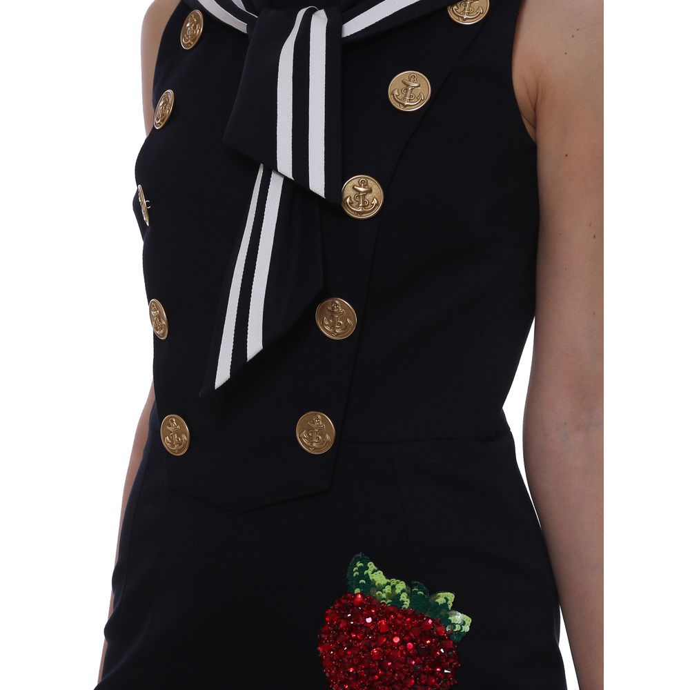 Dolce & Gabbana short sleeveless cotton sailor-themed dress with strawberry patch made from rhinestones and sequins, decorative buttons with anchor design, striped front band, lined interior with dot print
