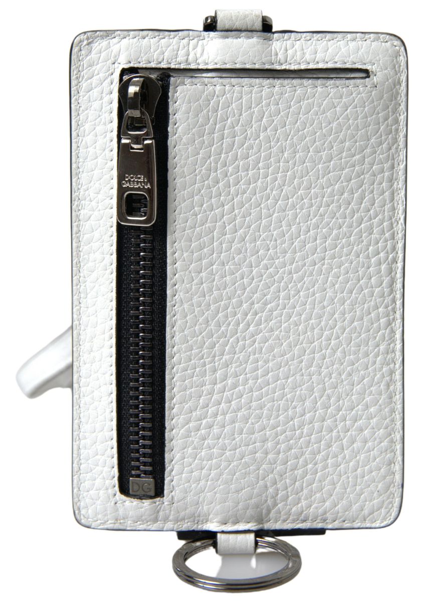 Experience classic elegance with this pristine white leather cardholder lanyard from the esteemed Dolce & Gabbana. Crafted with excellent Italian precision, this accessory is not only visually striking with its logo-embossed patch but also supremely functional. It features a commodious side zip fastening, a secure ring fastening, and ample card slots to organize your essentials with ease. Whether used for networking events or daily convenience, this cardholder is a testament to refined taste and luxury.