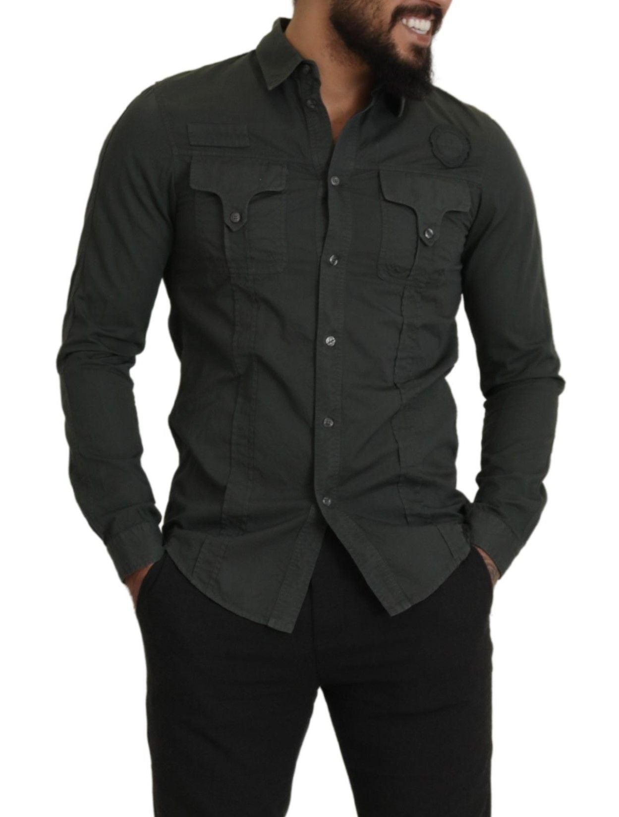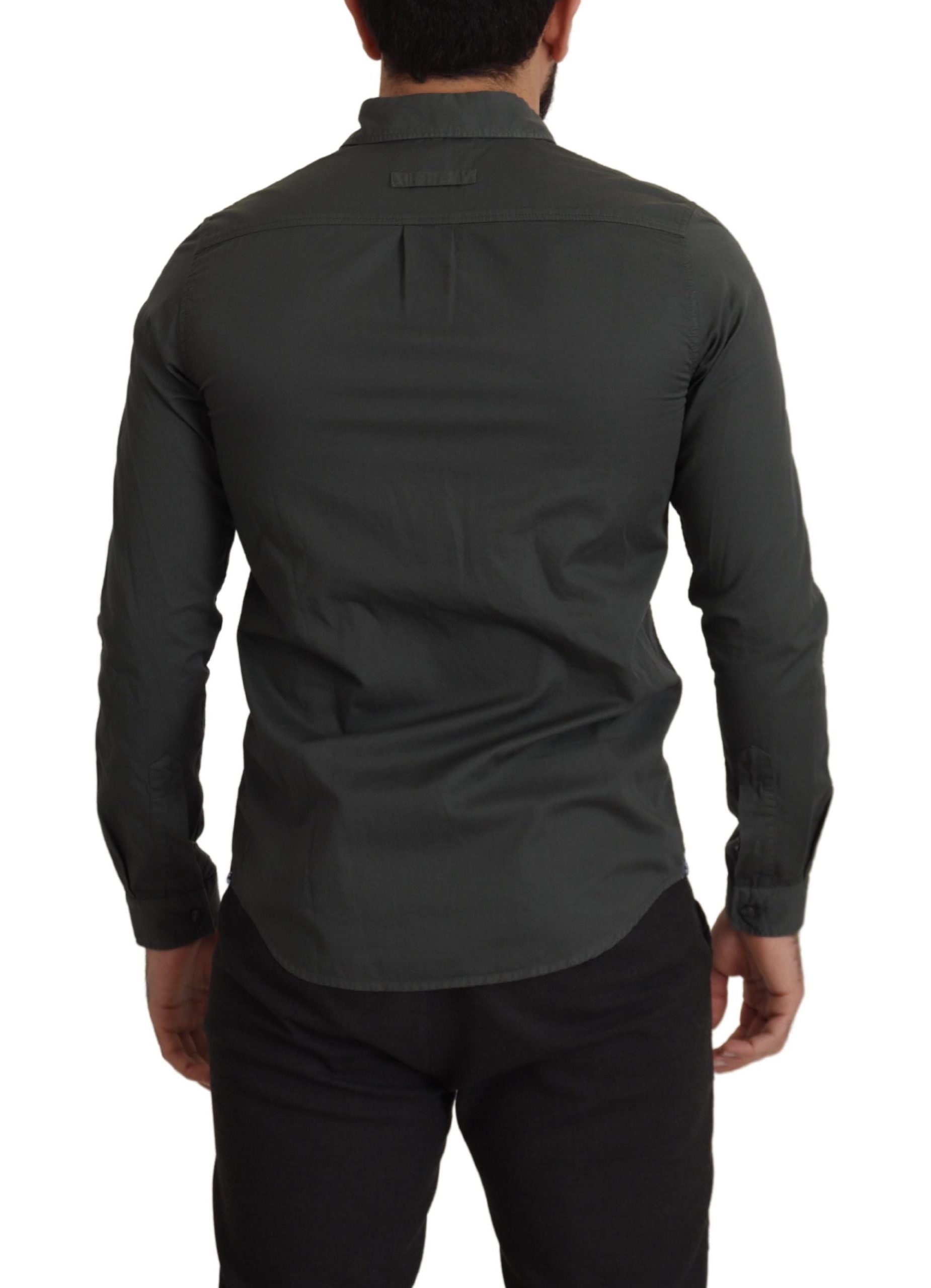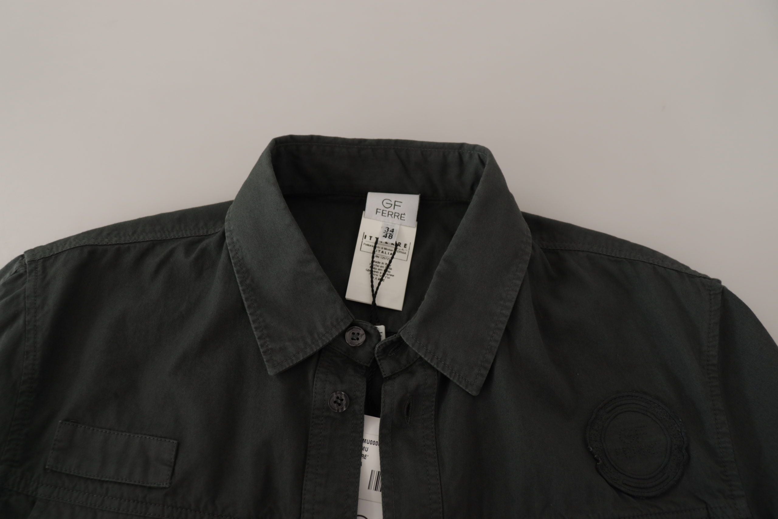 Elevate your style with this 100% Authentic GF Ferre casual shirt, perfect for any sophisticated wardrobe. This impeccable piece features a classic neck and long sleeves paired with a sleek button-down closure, offering a slim fit for that modern silhouette. Crafted from the finest cotton in a suave dark gray shade, the shirt is adorned with subtle logo details, highlighting its luxury identity. Proudly made in Italy, it promises to deliver both comfort and class.