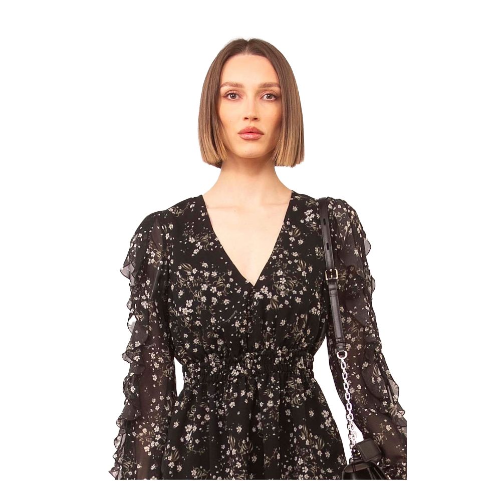 Patrizia Pepe short crepe dress with V-neck and draping on the sleeves, elasticated waist, flower print on a black background