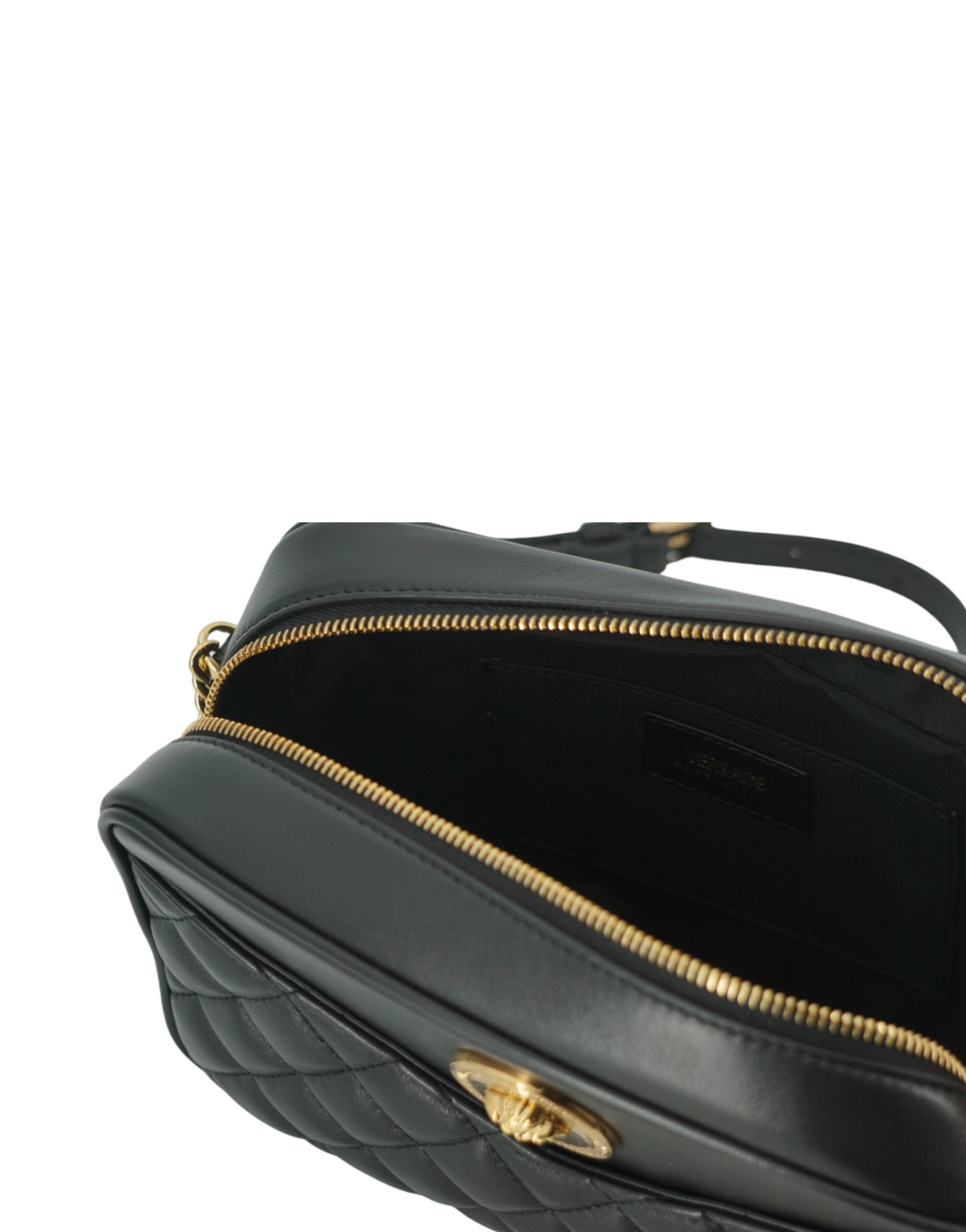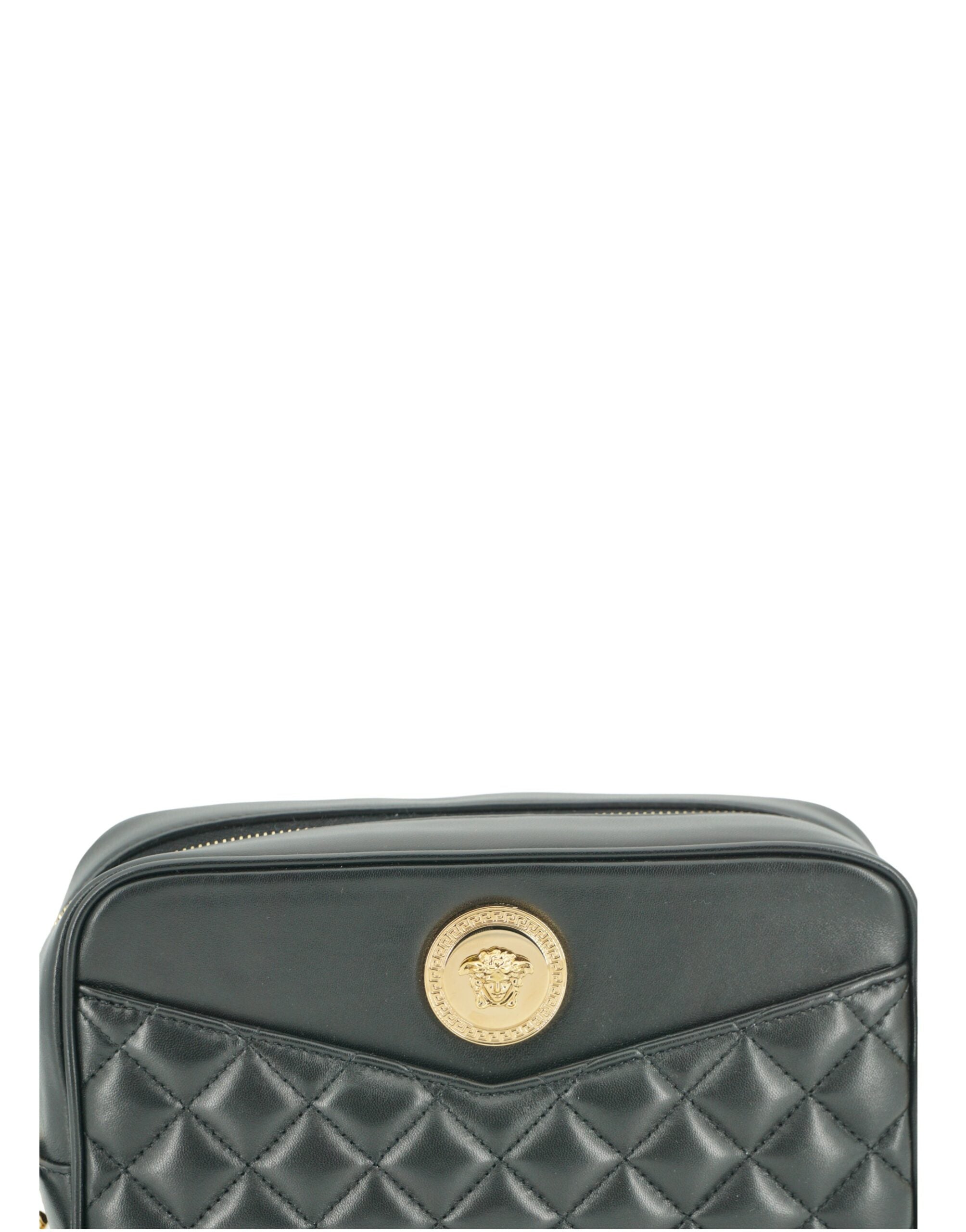 Indulge in the epitome of elegance with this exquisite Versace Medium Camera Shoulder Bag. Perfect for adding a touch of luxury to any outfit, this stunning bag seamlessly blends functionality with high fashion. Crafted from sumptuous lamb leather in a timeless black hue, the bag features the iconic Medusa head logo and is accented with gold-tone hardware for an opulent finish. Boasting a versatile 120cm chain and leather shoulder strap, it offers the option of shoulder or crossbody wear, adapting effortlessly to your style needs.
